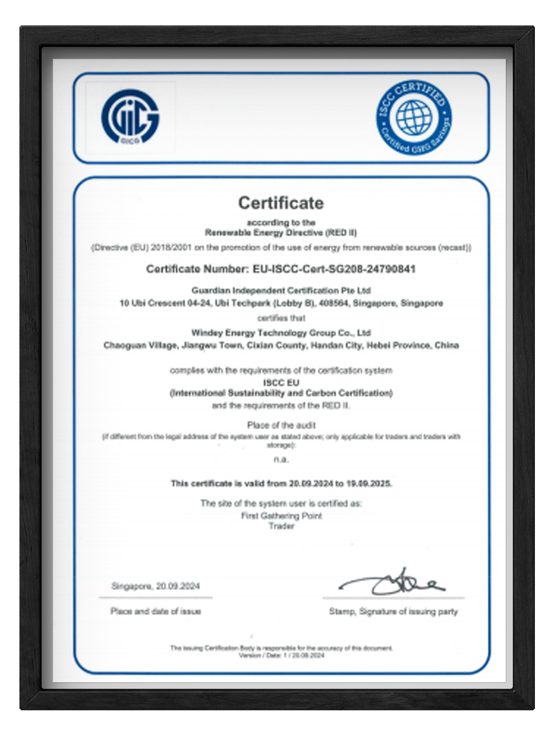 ISCC 是基于歐盟法規(guī)的可持續(xù)性標準,旗下的ISCC EU認證是綠色產(chǎn)品進入歐盟能源市場的強制認證,適用于歐盟在RED II中規(guī)定的生物燃料、生物液體和生物質(zhì)燃料等產(chǎn)品的可持續(xù)性標準要求。此次認證的取得,將為威尼斯9499登錄入口股份后續(xù)綠色甲醇產(chǎn)品認證工作提供有力的技術(shù)支撐。